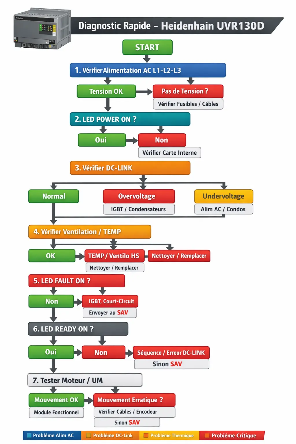 - Ready / Not ready : module refuse de démarrer, erreur DC-Link ou Fault active.